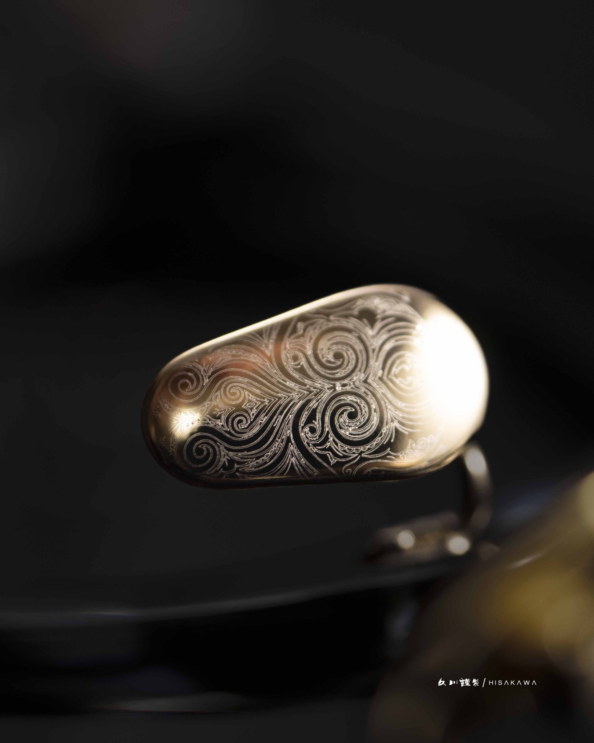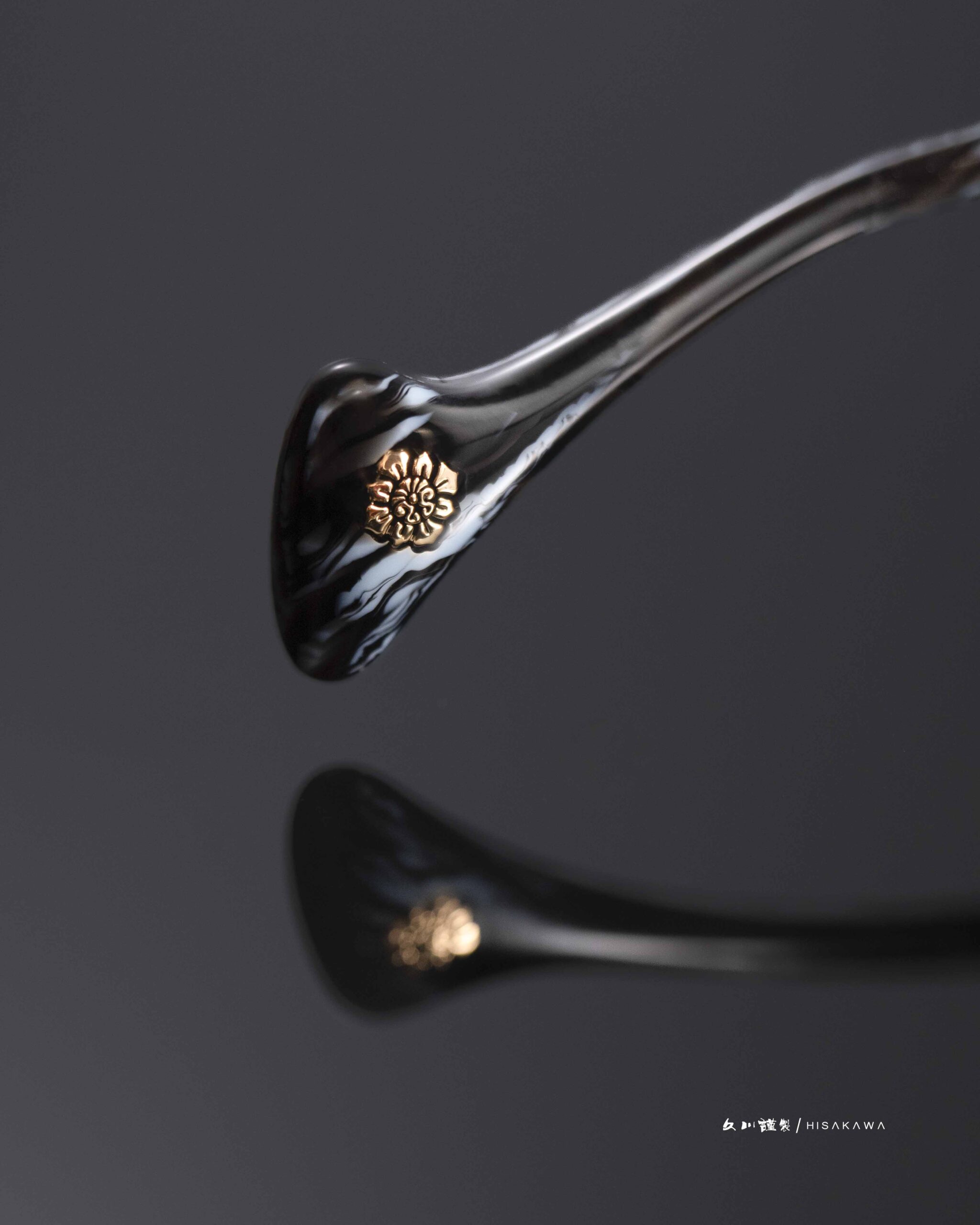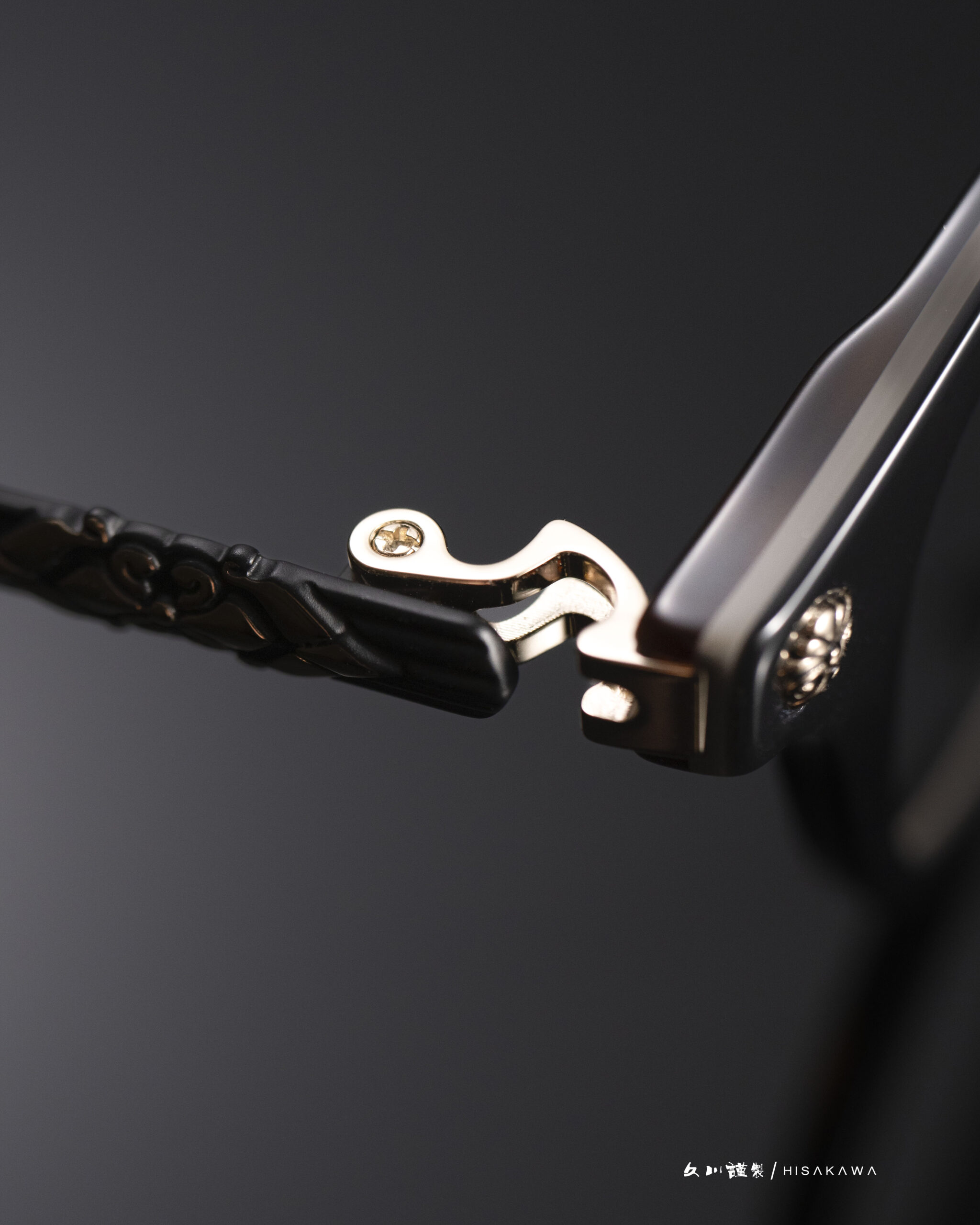 Our proprietary "Hawksbill" (Takanohashi) hinge radiates a platinum luster, its elegant curves reminiscent of the Sori—the iconic curvature of a Japanese sword.